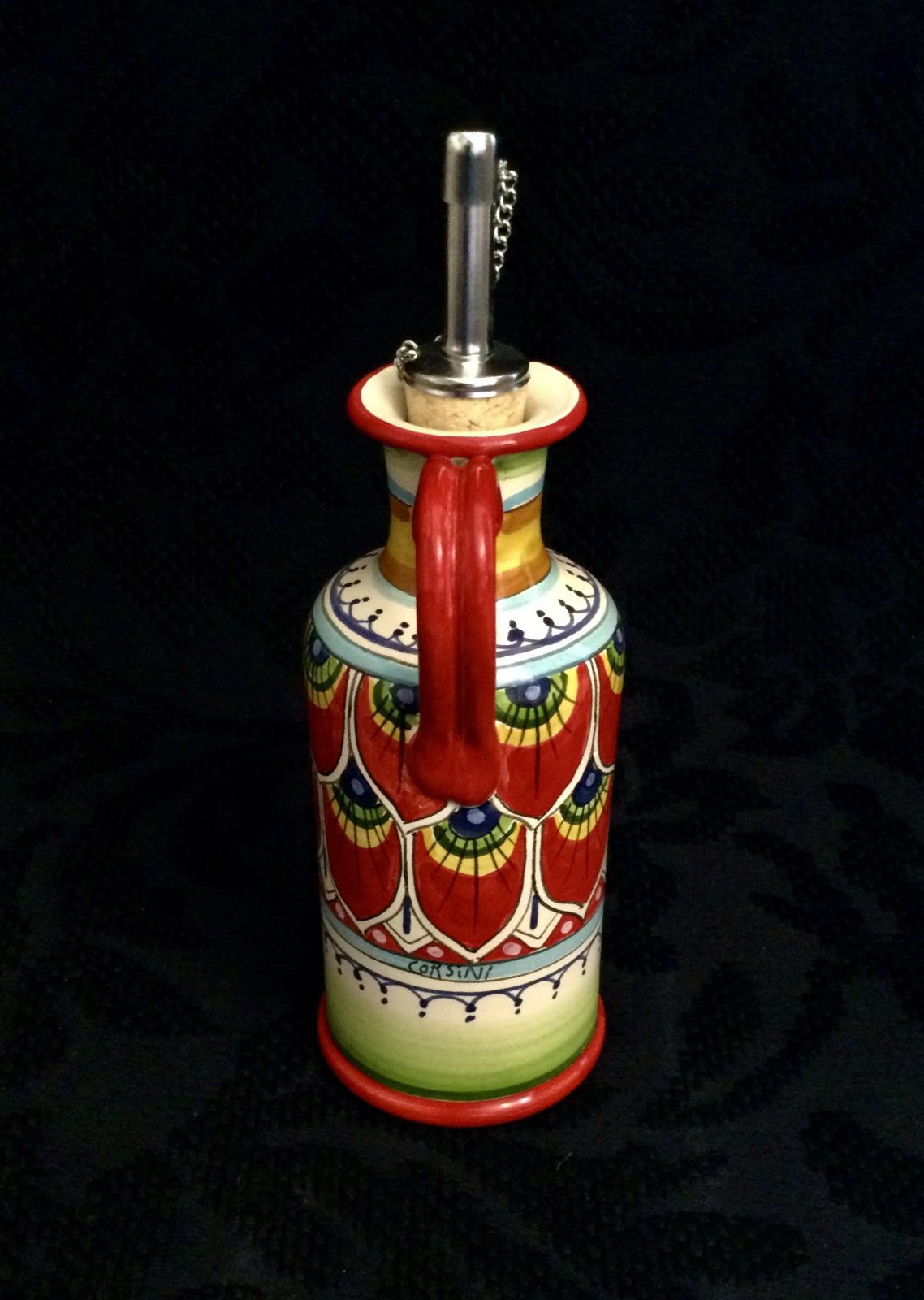 Ampolla con manico h16 penna di pavone rossa in Ceramica artigianale.Oggetto ideale per condire le vostre pietanze e arricchire le vostre tavole.